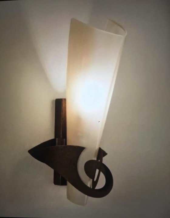 Set van 2 mooie Italiaans design wandlampen, in roest goud kleur. Houder van roestkleurige metalen structuur met goudkleurig Muranoglas voor zacht diffuus licht. In goede staat, onbeschadigd. nieuwprijs € 699,- per stuk