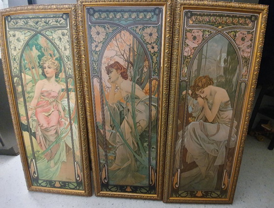 3 ingelijste prenten, schilderijen van Alphonse Mucha, Tijden van de dag, Art Deco