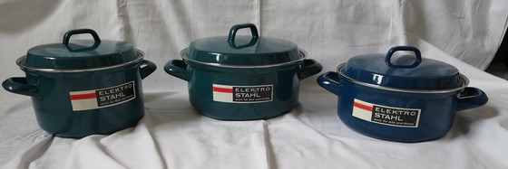Ik bied deze drie geëmailleerde potten aan, elk met een bijpassend deksel.