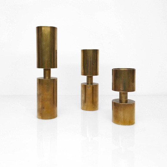 Een set van drie gedraaide massief messing kandelaars, gekenmerkt door een modulaire cilindrische constructie en een formele balans die typerend is voor Scandinavisch design uit de jaren 70. De gestapelde volumes, afwisselend massieve voetstukken en slanke stelen, creëren een ingetogen en strak architectonisch silhouet.
