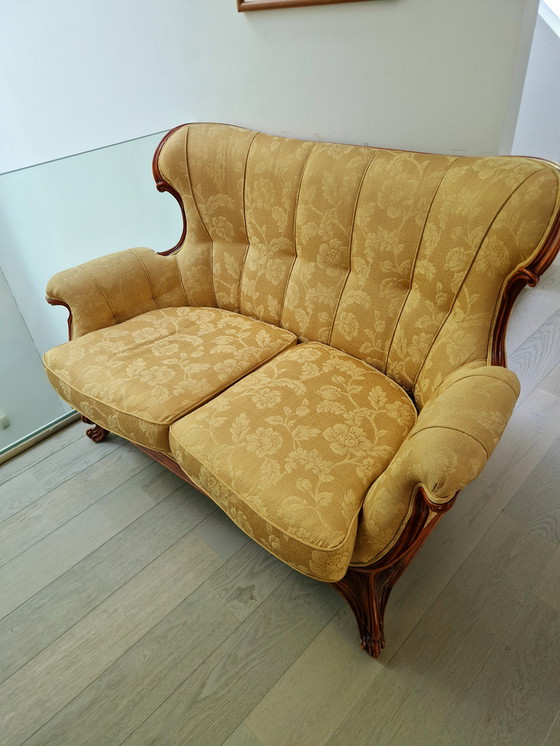 Deze set van 3 vintage salonbanken bestaat uit twee 2-zitters en een fauteuil, met elegante geelgouden bekleding met een bloemenpatroon en prachtig gesneden houten frames. Deze banken zijn perfect om een vleugje vintage charme toe te voegen aan elke woonruimte en bieden zowel stijl als comfort. Het ingewikkelde houtwerk en klassieke ontwerp maken ze een opvallende toevoeging aan je interieur.