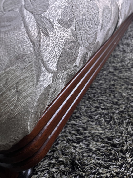 Stap binnen in een wereld van tijdloze elegantie met deze prachtig gerenoveerde driezitsbank. De verfijnde bloemenprint in een subtiele grijstint harmonieert perfect met het rijke bruine houten frame, waardoor een sophisticated meubelstuk ontstaat dat elke woonruimte naar een hoger niveau tilt. Vakkundig vervaardigd met een robuust houten frame, wat duurzaamheid en een tijdloze uitstraling garandeert. De luxueuze stof met een ingewikkeld bloemenpatroon biedt zowel comfort als stijl. Het klassieke ontwerp van de bank is perfect voor wie traditionele esthetiek met een moderne twist waardeert. Deze prachtige bank nodigt u uit om in stijl en comfort te ontspannen. Informeer vandaag nog en maak hem onderdeel van uw huis.