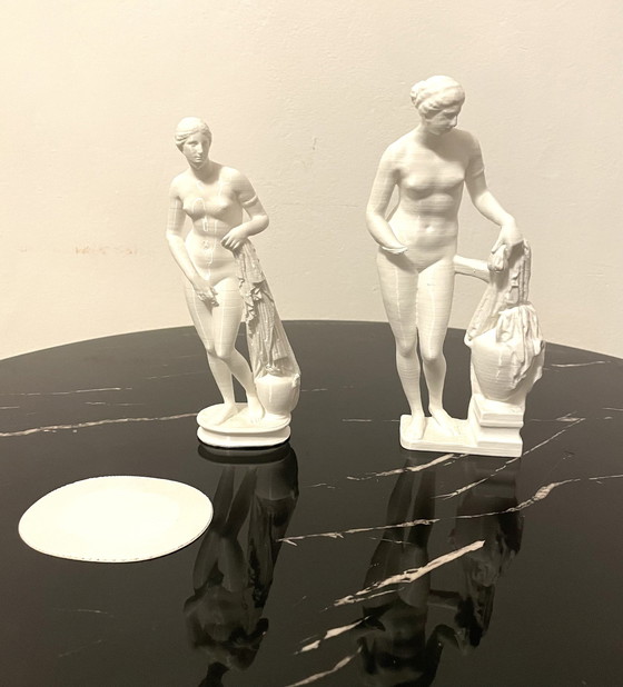 3 D geprinte vrouwen beeldjes . 1e beeldje is zonder rechter hand. , printer was gestopt helaas. Maar byzonder mooi object voor in de woonkamer . Jaartal : 2022 . Materiaal Plastic . Hoogte : 20 cm Breedte : 8 cm . Staan in een rookvrij huis. Wordt verzonden in Bubble plastic