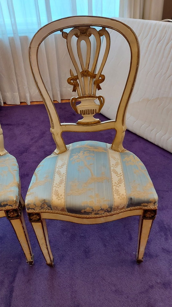 Deze set van drie antieke stoelen brengt een vleugje elegantie en geschiedenis in je interieur. Met hun klassieke ontwerp en verfijnde details zijn ze een echte blikvanger in elke kamer. De stoelen zijn bekleed met een prachtige blauwe en gouden stof die een gevoel van luxe uitstraalt.