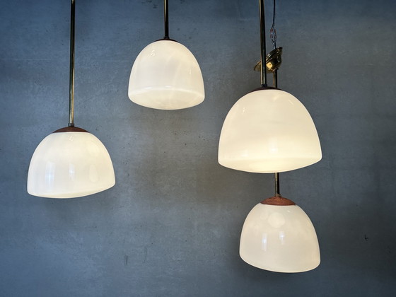Drie originele opaline schoollampen met messing armatuur. Bakelieten E27 fitting. Messing kaphouder vertoont ouderdomssporen (zie foto’s). Niet zichtbaar eens de lamp is opgehangen. Opaline in uitstekende staat. Gewicht: 2kg. Totale lengte: 85cm. Diameter: 30cm. Vernieuwde bekabeling. Prijs is voor één lamp. In voorraad: 3