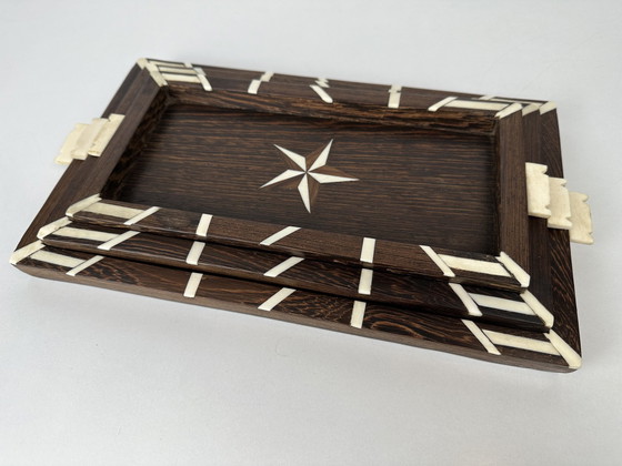 3 decoratieve dienbladen in hardhout. Inlegwerk. Afmetingen: 33cmx20cm voor het grootste dienblad. 26cm x 13cm voor het kleinste dienblad. Hoogte per dienblad: 2cm. Totale hoogte: 4cm. Gewicht: 1,5kg.