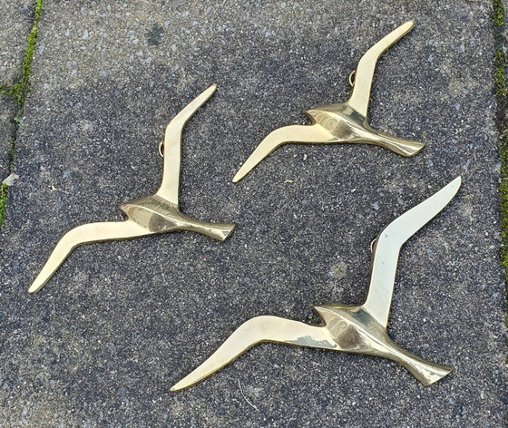 Fraaie set van drie messing vogels in vlucht uit het midden van de vorige eeuw (mid century), ontworpen in een strakke, gestileerde vorm die doet denken aan zeevogels/mmeuwen.