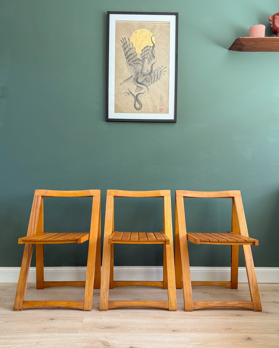 Set van 3 Trieste klapstoelen ontworpen door Aldo Jacober in de jaren 60 voor Bazzini. Deze stoelen zijn gemaakt van hoogwaardig hout en hebben een elegante, minimalistische uitstraling die perfect past in een Mid Century Modern interieur. Ze zijn eenvoudig op te vouwen, waardoor ze gemakkelijk op te bergen zijn. Ideaal voor extra zitplaatsen bij speciale gelegenheden of als stijlvolle toevoeging aan uw interieur. In goede vintage conditie.