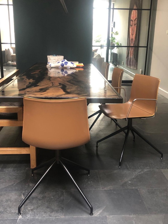 - Deze stoelen zijn vervaardigd van hoogwaardig bruin leer en hebben een slanke zwarte kruisvoet die zorgt voor stabiliteit en stijl.