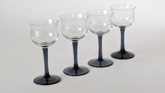 Vier prachtige glazen “Carmen” uit de Sonoor-collectie van Glasfabriek Leerdam, ontworpen door Andries Copier in 1935. Copier, een van de bekendste Nederlandse glasontwerpers, was jarenlang verbonden aan Leerdam en bracht met zijn ontwerpen eenvoud en verfijning samen. De Sonoor-collectie kenmerkt zich door helder glas en subtiele kleurnuances, waaronder het kenmerkende ‘druivenblauw’. • Set van 4 bitterglazen (model Carmen) – helder glas met een blauw-grijze voet, hoogte 9,6 cm, inhoud 5 cl De glaasjes verkeren in uitstekende staat. Ik heb ze ook nog in een iets grotere maat.