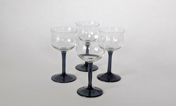 Vier prachtige glazen “Carmen” uit de Sonoor-collectie van Glasfabriek Leerdam, ontworpen door Andries Copier in 1935. Copier, een van de bekendste Nederlandse glasontwerpers, was jarenlang verbonden aan Leerdam en bracht met zijn ontwerpen eenvoud en verfijning samen. De Sonoor-collectie kenmerkt zich door helder glas en subtiele kleurnuances, waaronder het kenmerkende ‘druivenblauw’. • Set van 4 portglazen – (model Carmen) – helder glas met een blauw-grijze voet, hoogte 11 cm, inhoud 7cl De glaasjes verkeren in uitstekende staat. Ik heb deze glaasjes ook nog in een iets kleinere maat (5cl).