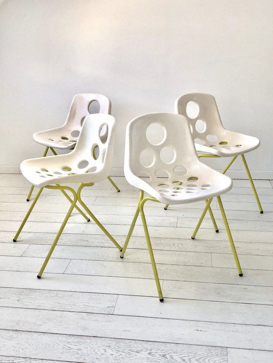 Set van vier buitenstoelen ontworpen door M. Paris, editie Sicopal 1972. Ze zijn stapelbaar, met witte PVC-honingraatschalen en anijsgelakte metalen X-poten.