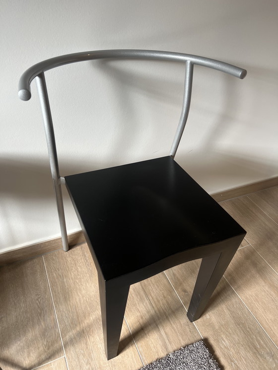 Deze eetkamerstoel dateert uit de jaren 80 en is ontworpen door Philippe Starck voor Kartell. De stoelen hebben lichte gebruikerssporen die passen bij de leeftijd...