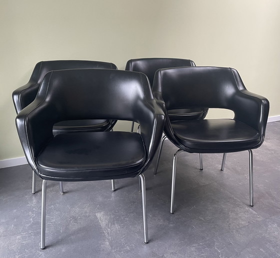 Maak kennis met een set van vier prachtige "Mini Kilta" stoelen, een bewijs van tijdloos design en functionaliteit. Deze stoelen, met hun strakke zwarte leren bekleding en stevige metalen poten, bieden zowel comfort als stijl, waardoor ze een perfecte aanvulling vormen op elk modern interieur.