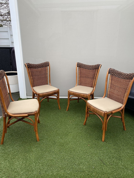 4 stuks Rotan eetkamer stoelen. Deze stoelen hebben een bijzondere zwarte afwerking en een stoffen zitting. Deze zijn gemaakt in de 70’er jaren en afkomstig uit frankrijk. Verkeren in een nette vintage staat