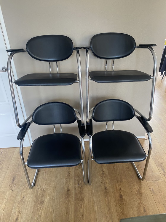 4 vintage Italiaanse design stoelen Effezeta jaren 80. Met chromen frame en zwarte kunststof zitting en rugleuning. De stoelen zijn in originele staat. Gebruikt maar nog netjes.