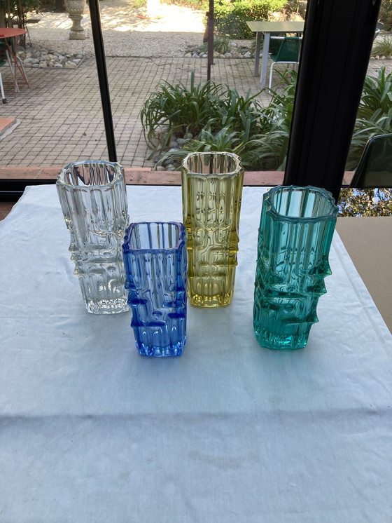 4 vazen van VLADISLAV URBAN voor de unie van Sklo vierkante vaas uit Moravia Tsjechisch glas een blauwe vaas, een witte vaas, een groene vaas, een gele vaas ze zijn in perfecte, staat, geen fele, noch gebroken 3 H24,5. En 1 H 20cm
