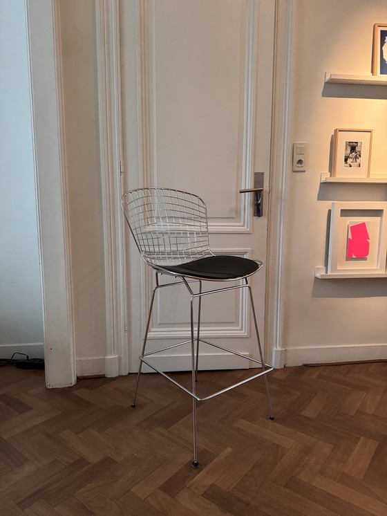 Verrijk uw interieur met deze prachtige set van vier barkrukken met draadstoel, geïnspireerd op de iconische ontwerpen van Bertoia. Deze barkrukken belichamen de elegantie van de Mid Century Modern-stijl en voegen een vleugje verfijning toe aan elke setting. De robuuste metalen draadframeconstructie garandeert duurzaamheid en biedt een strakke, luchtige uitstraling. Gecompleteerd door een zwarte leren zitting bieden deze barkrukken comfort en stijl, waardoor ze een perfecte aanvulling zijn op zowel woon- als kantoorruimtes. Ze passen naadloos bij diverse interieurstijlen en vormen een chique zitoplossing die vorm en functie op een prachtige manier combineert.