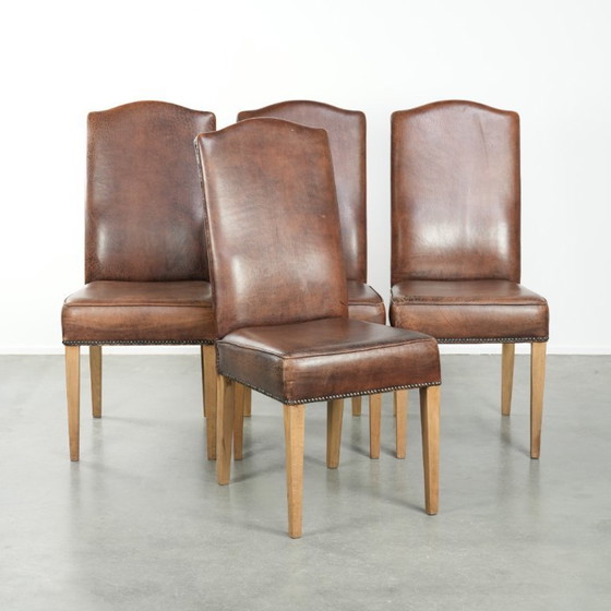 Deze set van 4 vintage eetkamerstoelen is gemaakt van hoogwaardig schapenleer. De stoelen hebben een hoge rug en zijn verfijnd afgewerkt met stijlvolle siernagels, wat zorgt voor een klassieke en luxe uitstraling. De set laat zich gemakkelijk plaatsen in nagenoeg iedere interieurstijl en aan zowel een antieke als moderne eettafel komen ze perfect tot hun recht. Ze hebben door de jaren heen een prachtig patina verkregen, wat bijdraagt aan hun authentieke karakter. Door verantwoord gebruik hebben ze normale gebruikssporen opgelopen, passend bij hun leeftijd. Structureel zijn ze in een goede en uiteraard direct inzetbare staat. Ziet u zichzelf al op deze stoelen aan de eettafel zitten?