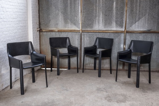 Set van 4 zwarte eetkamerstoelen in de stijl van Mario Bellini en Jacques Adnet van De Couro uit Brazilië. Ontworpen in de jaren 70, deze set is geproduceerd in 1991.