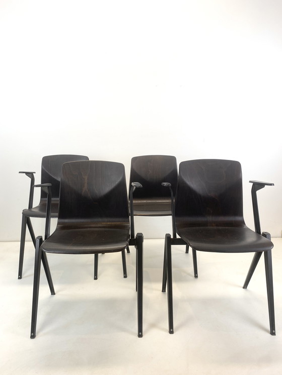 Zeer mooie ontwerp, geïnspireerd door de Pyramide stoel van Wim Rietveld - dit is de Galvanitas model S22 schoolstoel met armleuningen. De zitting is donkerbruin en gemaakt door het Duitse Pakholz. De frame is zwart gebogen metal. Stapelbaar.