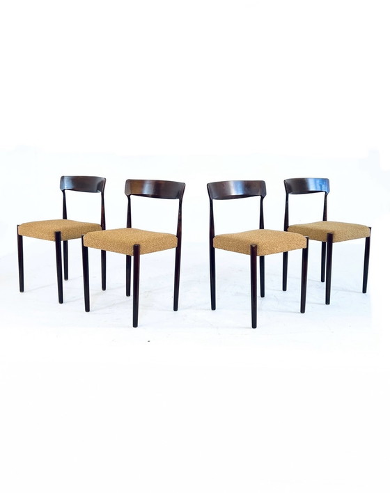 Prachtig en uniek setje, deze kom je niet vaak tegen. Prachtig massief teakhouten frame. Mooie ronde randen en organisch gevormde rugleuning. Voorzien van sierlijke messing ring in de poot. De frames zijn gereinigd en hebben een nieuwe finish. Ze zijn constructief nagelopen en in solide staat.