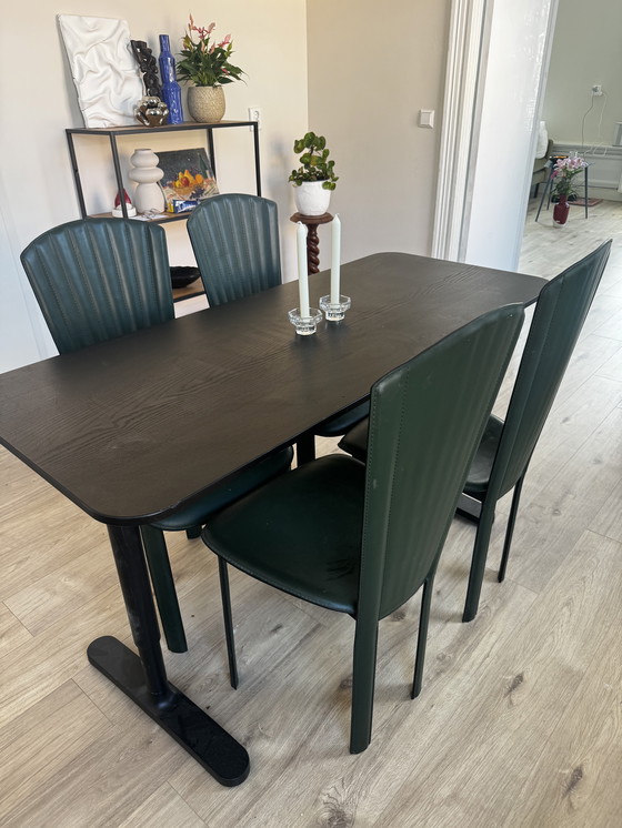 Set van vier leren eettafelstoelen in Italiaans design. Deze stoelen zijn bekleed met groen leer en hebben een elegante uitstraling. Het metalen frame zorgt voor stevigheid en duurzaamheid. Perfect voor een moderne eetkamer.