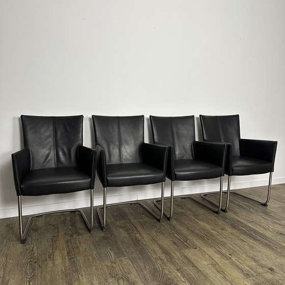 Hierbij een set van 4 originele Bert Plantagie stoelen aan, uitgevoerd in luxe zwart leder. Deze stoelen passen perfect in een modern of tijdloos interieur en staan bekend om hun hoogwaardige afwerking en zitcomfort. Specificaties: • Merk: Bert Plantagie • Aantal: 4 stuks • Materiaal: Zwart leder • Frame: RVS sledeonderstel • Hoogte armleuning: 67 cm • Conditie: In goede staat, zorgvuldig onderhouden Prijs & Levering: Nieuwprijs: €2600 voor de set Nu voor 4 stoelen €750,- inclusief bezorging. Ben je geïnteresseerd of heb je vragen? Neem gerust contact op! De stoelen zijn direct beschikbaar.