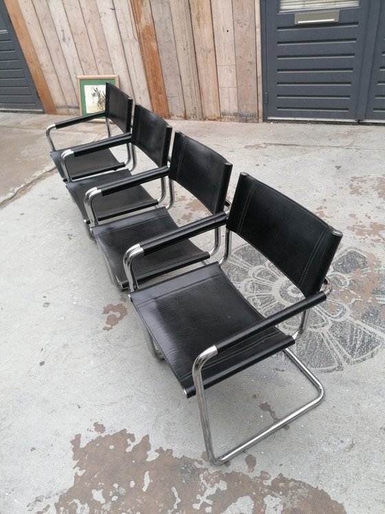 Schitterende stoelen toegeschreven naar model van mart stam. Hoge kwaliteit tuigleer. De stoelen zijn niet gemerkt dus of het Thonet , jox is kan ik niet met zekerheid zeggen. Het tuigleer is in een mooie vintage conditie. De gebruikelijke gebruikssporen voor een stoel van haar leeftijd. Chroom ook in een nette conditie. Sommige plekken door gebruik iets doffer, maar al met al een schitterende set van 4 stoelen.