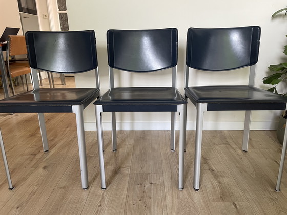 Set van 4 Matteo Grassi eetkamerstoelen in donkerblauw. Deze stoelen combineren een strak modern design met comfort. De zittingen en rugleuningen zijn bekleed met hoogwaardig leer, terwijl de stevige metalen poten zorgen voor stabiliteit en duurzaamheid. Perfect voor een eigentijdse eetkamer of kantoorruimte.