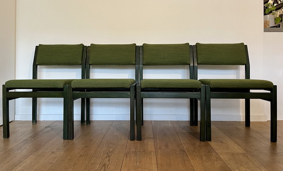 Prachtige houten stoelen, groen gebeitst, met originele groene bekleding er op.