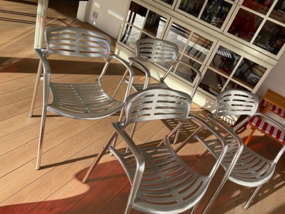 Vintage set van vier Toledo stoelen ontworpen door Jorge Pensi voor Amat-3. Deze moderne stoelen zijn vervaardigd uit duurzaam aluminium en hebben een strakke, zilveren afwerking die perfect past in een eigentijds interieur. Ideaal voor zowel binnen als buiten gebruik, bieden ze comfort en stijl in één. Stoelen zijn intensief gebruikt (zie detailfoto's)