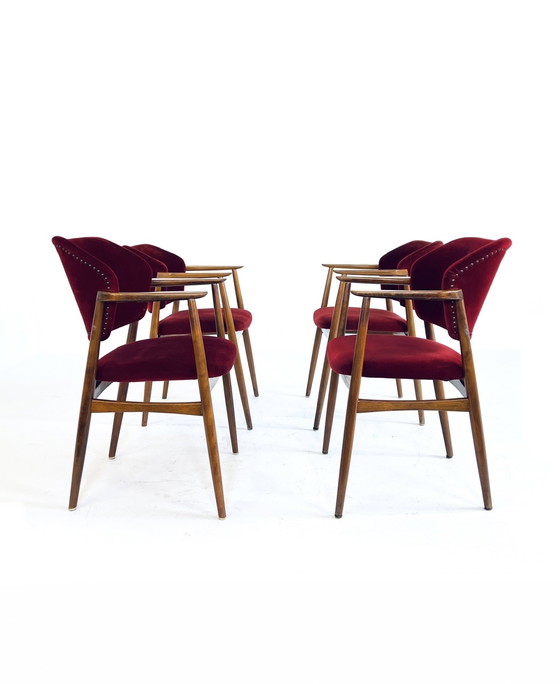 De stoelen hebben een waanzinnige bordeauxrode velvet stoffering en zijn daardoor echte eyecatchers. De stoffering is nog in hele nette staat. Geen sleetse plekken of scheuren. 2 stoelen hebben siernagels aan de achterzijde, 2 stoelen niet.