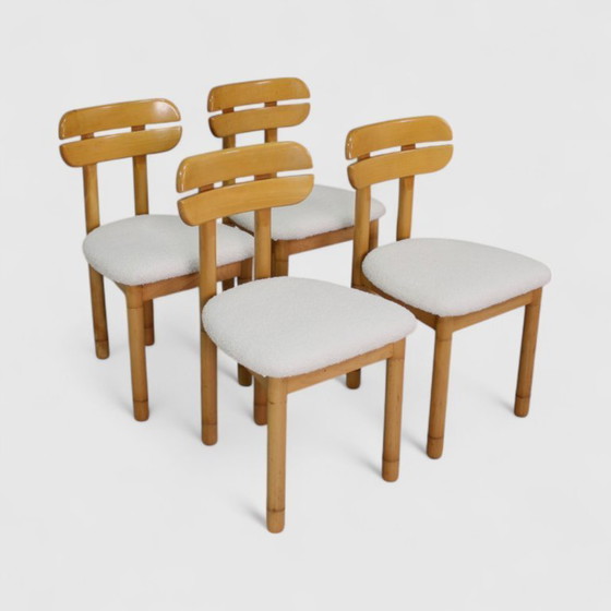 Deze houten eetkamerstoelen uit de jaren '70 zijn opnieuw bekleed met een gebroken witte teddystof. Hierdoor passen ze perfect in een modern, rustig interieur. Deze zachte vintage stoelen worden enkel per set van vier stuks verkocht.