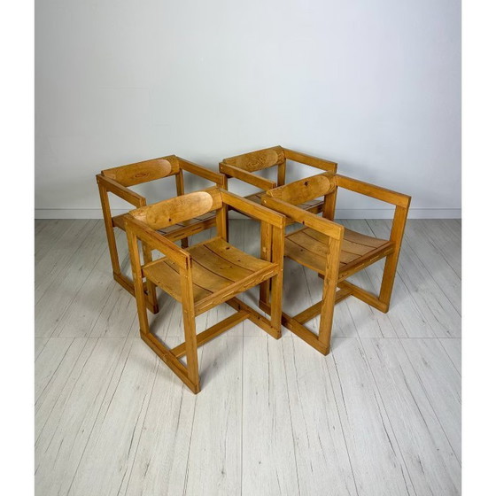 Set van 4 Vintage Model 313 stoelen ontworpen in de jaren 1960 door Edvin Helseth als onderdeel van de Trybo-serie voor Stange Bruk, Noorwegen. Gemaakt van dennenhout met penverbindingen zonder schroeven of lijm. Voorzien van een draaibare gevormde rugleuning die zich aanpast aan je rug en een lattenzitting. In nette staat met ouderdomsspoortjes.