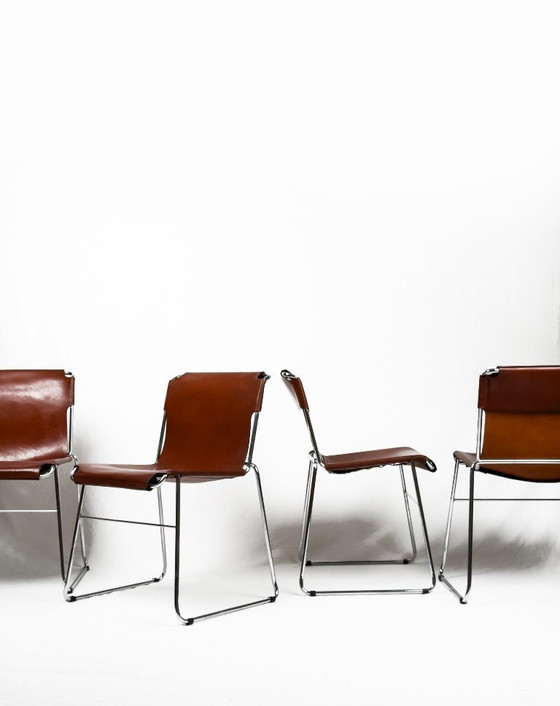4x vintage modernistische Italiaanse buisvormige chromen en leren stoelen, jaren 70