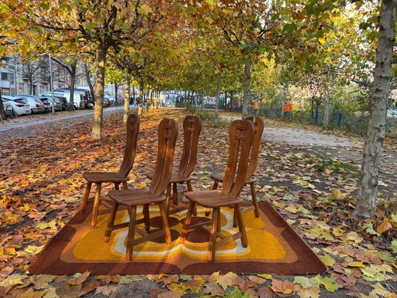 5 brutalistische stoelen, massief eikenhout, De Puydt, vintage jaren 60