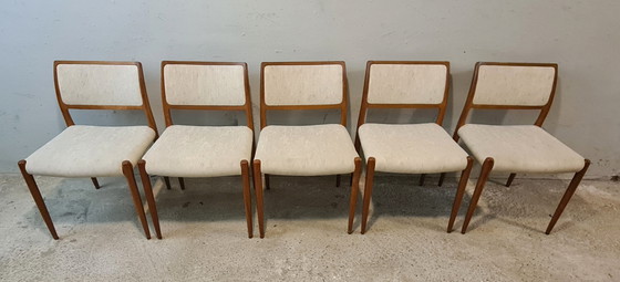 Vijf schitterende vintage, design eetkamerstoelen, Model 80 van Deense bodem aangeboden. Deze stoelen zijn ontworpen door Niels O. Møller voor J.L Møller Models