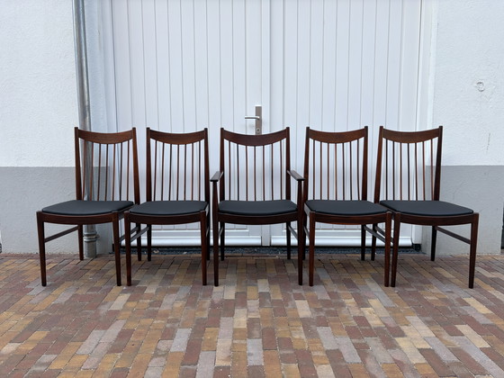 - Ontworpen door de gerenommeerde Arne Vodder, belichamen deze stoelen de klassieke Mid Century Modern stijl met hun strakke lijnen en verfijnde uitstraling.