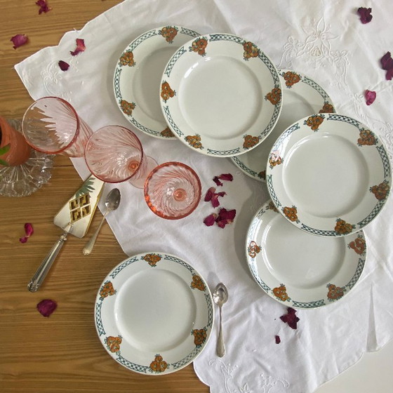 6 antieke ijzerstenen dessertborden van Moulin des Loups en Hamage, meidoornmotief