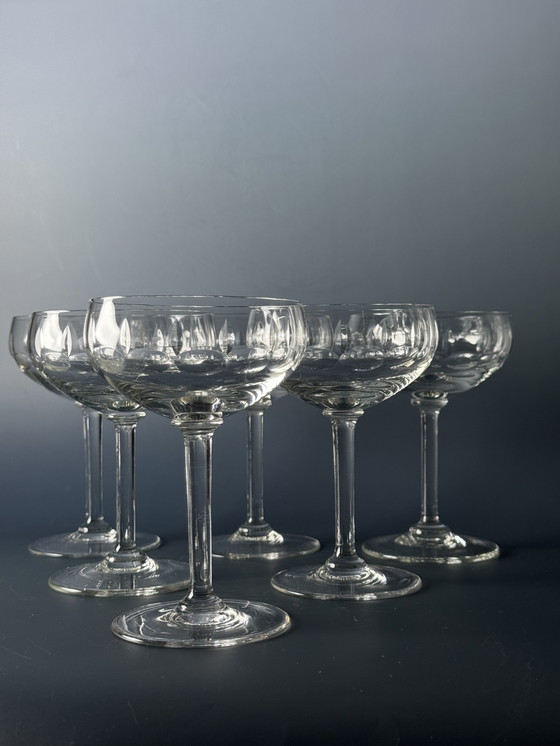 Set van zes elegante coupeglazen van Verreries Doyen, gemaakt van demi-kristal en versierd met handgeslepen geometrische bladmotieven rond de kom. Het verfijnde ontwerp en de evenwichtige proporties weerspiegelen de Art Deco esthetiek die populair was in het begin van de 20e eeuw, met name de jaren 1930.