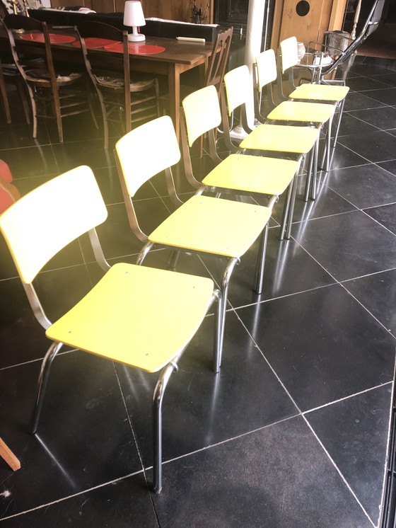 Deze set van 6 eetkamer- of bureaustoelen van Copray & Scholten is een prachtige aanvulling voor elk modern interieur. De stoelen hebben een opvallend geel zitvlak en rugleuning, gecombineerd met een zilverkleurig metalen frame, wat zorgt voor een frisse en eigentijdse uitstraling. Ze zijn ideaal voor zowel de eetkamer als het kantoor, en bieden een comfortabele zitervaring. De stoelen zijn in uitstekende staat en klaar voor gebruik. Een van de stoelen moet gerepareerd worden aan de zitting. Design uit de jaren 90.