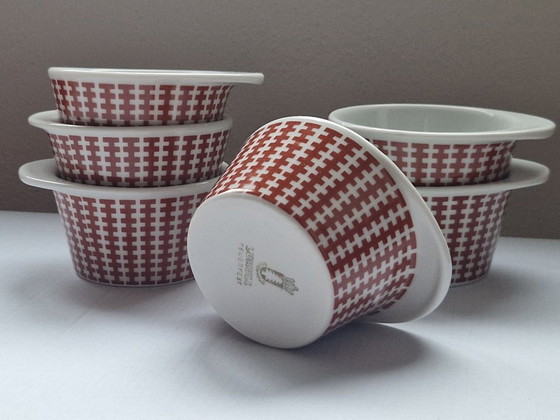 Ga terug in de tijd met deze prachtige set van zes porseleinen soufflévormen van het gerenommeerde merk Schönwald, vervaardigd in Duitsland in 1963. Deze vormen getuigen van tijdloos design en functionaliteit, perfect voor zowel verzamelaars als culinaire liefhebbers. Gemaakt van hoogwaardig porselein, zijn deze vormen niet alleen duurzaam, maar ook prachtig vormgegeven met een opvallend rood-wit patroon dat een vleugje vintage charme aan elke keuken toevoegt. De vormen zijn gemerkt met het Lukull Feuerfest-keurmerk, wat hun authenticiteit en hittebestendigheid garandeert, waardoor ze ideaal zijn voor het bakken van uw favoriete soufflés of andere heerlijke gerechten. Met hun elegante ontwerp en historische betekenis zijn deze vormen perfect om neer te zetten of praktisch te gebruiken, en bieden ze een unieke combinatie van stijl en functionaliteit. Voeg een stukje geschiedenis toe aan uw keukencollectie met deze charmante vormen en geniet van de perfecte mix van schoonheid en functionaliteit.
