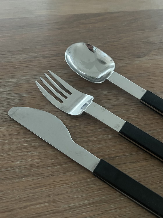 Set van 6 abert nicrosil 18/12 modernistisch bestek. Metalen bestek met kunstof handvat. Unieke vorm met veel jaren 70 karakter.