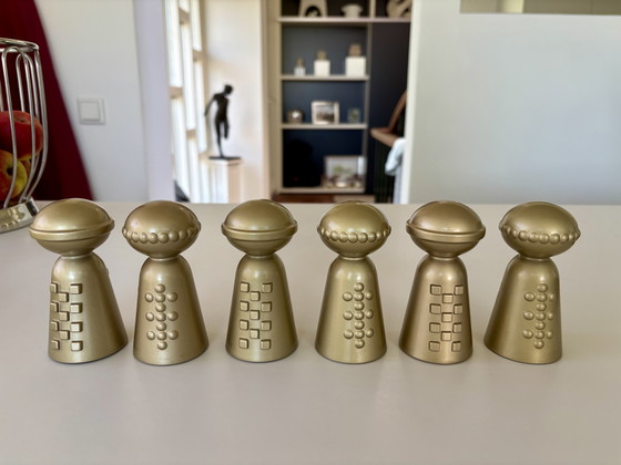 Set van 6 Kungora poppetjes beeldjes ontworpen door Miya Suwa uit Japan. Deze moderne sculpturen zijn gemaakt van metaal en hebben een opvallende gouden kleur. Elk beeldje heeft een uniek patroon van reliëfvormen, wat bijdraagt aan hun artistieke uitstraling. Perfect voor liefhebbers van moderne kunst en design.