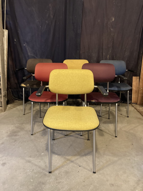 Zes Gispenstoelen uit de jaren ‘80, mat verchroomd frame en kunststof armleggers, alles onbeschadigd. Vijf dienen opnieuw bekleed te worden, de zesde (op de foto’s voorste stoel) heb ik al opnieuw gestoffeerd in een okergele stof en voorzien van nieuw schuim. Indien gewenst is tegen een kleine meerprijs die stof aanwezig voor de andere stoelen evenals nieuwe gispenklemmen. Onder 1 van de stoelen zit een sticker van Car Katwijk, vermoedelijk komen ze daar vandaan.