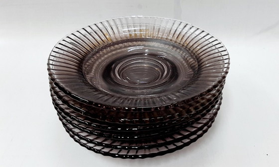 We presenteren u zes prachtige dessertborden. Ze komen uit Wenen. Ze zijn gemaakt van violet reliëfglas. Ze zijn geschikt voor het serveren van taarten en allerlei desserts. De borden zijn in zeer goede staat. Geen scheuren, barsten of chips. Dit is een set van 6 en wordt als set verkocht.