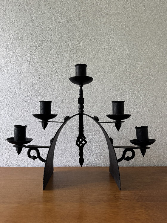 Imposante massieve smeed- en hamerslagijzeren kandelaar in de Brutalistische stijl uit de jaren 60, prachtig gemaakt met fijne decoratieve en afwerkingselementen; zeer goede staat.