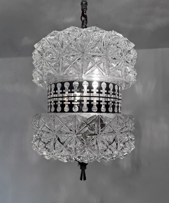 Kleine kroonluchter uit de jaren 60/70 van voorgevormd glas en verchroomd metaal bestaande uit 2 glazen bollen met een centrale opengewerkte ring en verchroomde metalen elementen aan de boven- en onderkant; al met al in zeer goede staat (1 glas is gebarsten aan de binnenkant, alleen zichtbaar als de kroonluchter uit elkaar is gehaald), voor bajonetlamp.