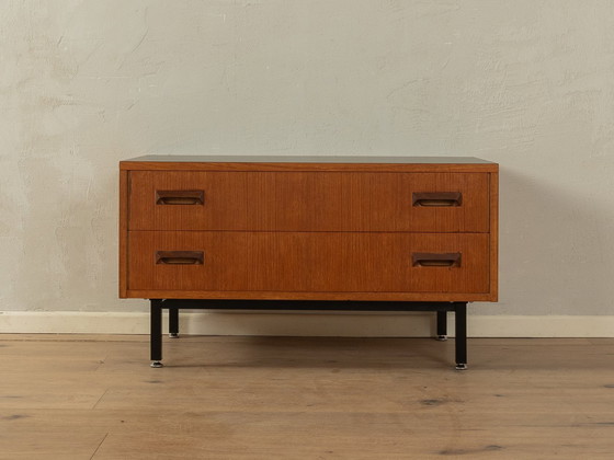 Klassieke ladekast uit de jaren 1960. Corpus in teakfineer met twee laden en nieuwe vierkante stalen poten in zwart. Het bovenblad is bekleed met zwart formica. Gemaakt in Duitsland, fabrikant: DeWe Deutsche Werkstätten.